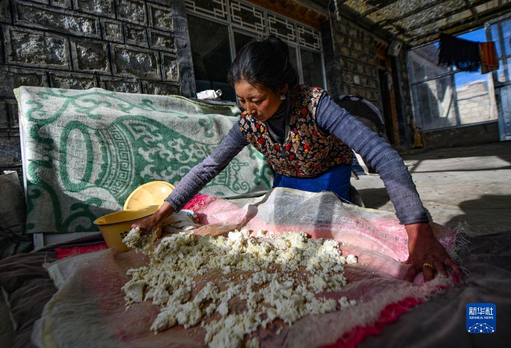 在西藏當雄縣納木湖鄉達布村的冬季放牧點,牧民在制作奶渣(11月10日攝)。
