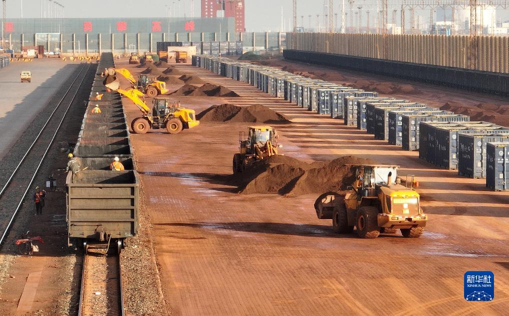 11月13日,在天津港“公轉鐵”“散改集”雙示范基地內,鏟運機將鐵礦石裝入集裝箱內(無人機照片)。