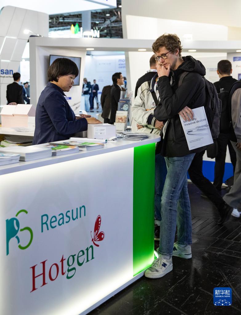 11月13日,在德國杜塞爾多夫國際醫療器械設備展,參觀者在熱景生物展位咨詢洽談。新華社記者 張帆 攝