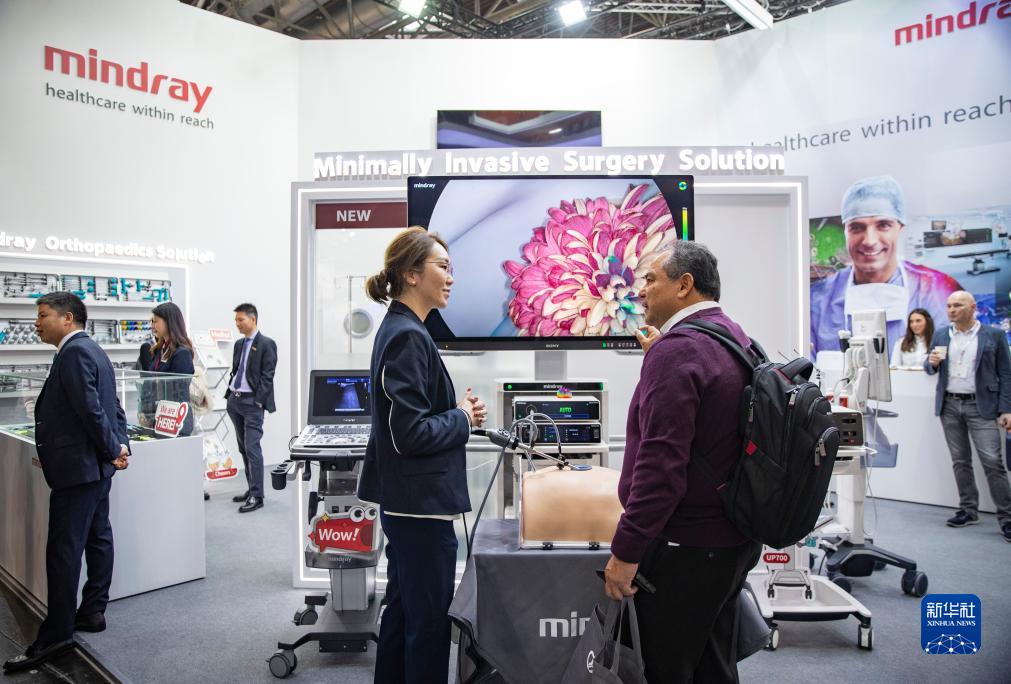 11月13日,在德國杜塞爾多夫國際醫療器械設備展,參觀者在邁瑞醫療展位咨詢洽談。新華社記者 張帆 攝