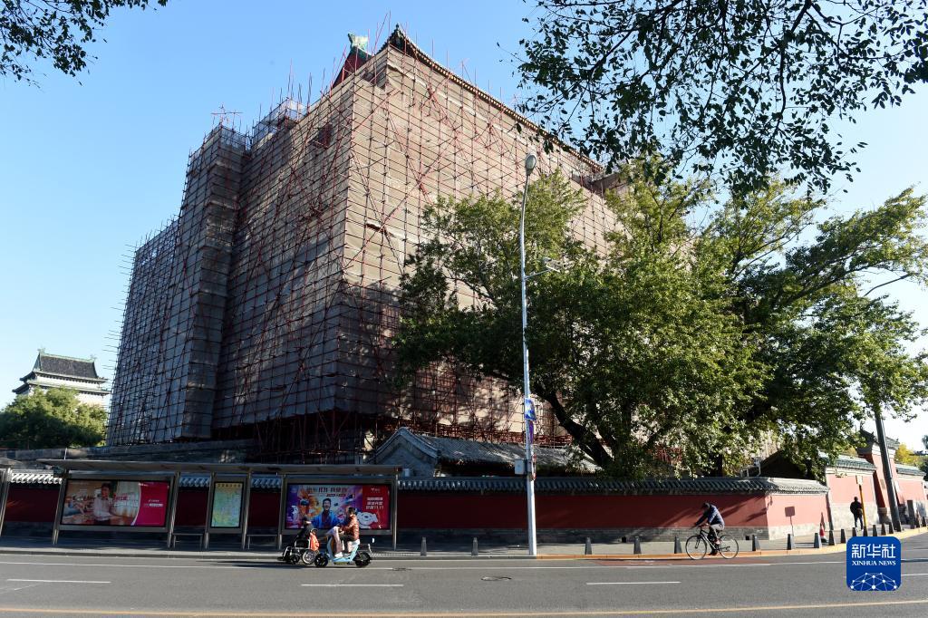 北京鐘樓(左)和修繕中的北京鼓樓(11月7日攝)。鐘鼓樓位于北京中軸線的最北端,兩樓前后縱置,氣勢雄偉。作為元、明、清三代都城的報時中心,至今已有700多年的歷史。