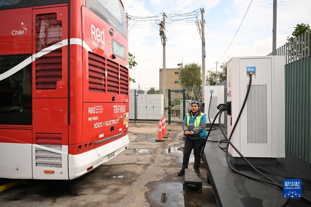 11月2日,在智利首都圣地亞哥,520路新能源公交車司機寶拉站在一座快充站旁。