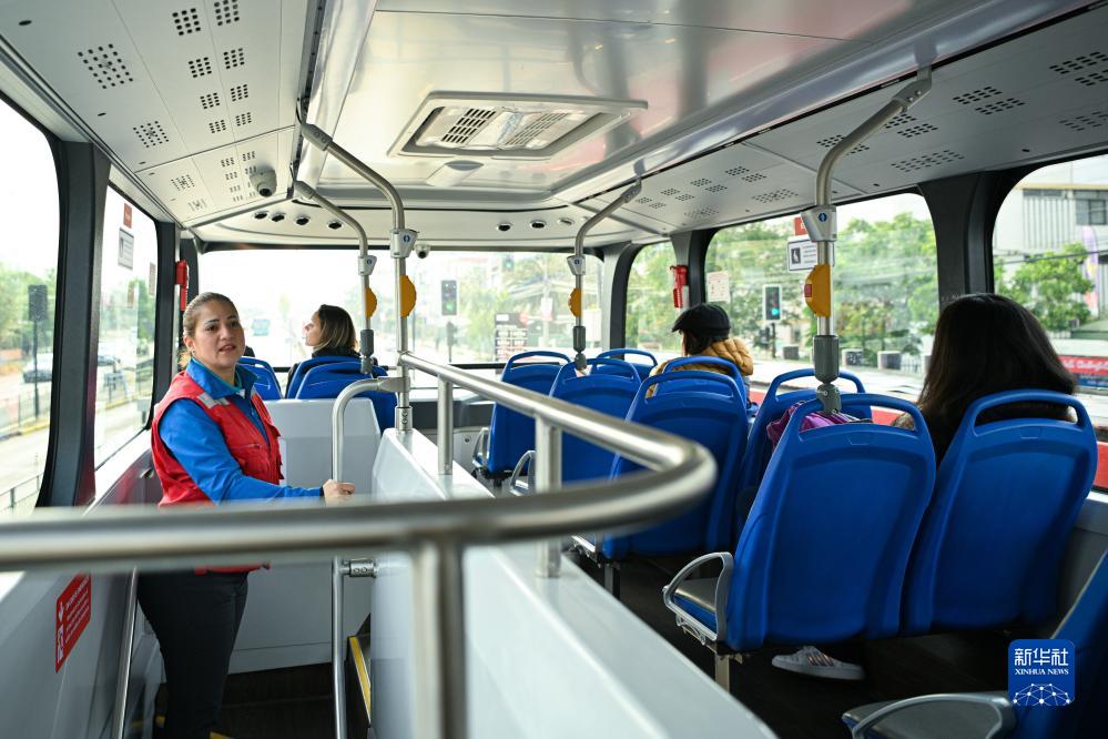 11月2日,在智利首都圣地亞哥,一輛520路新能源公交車的工作人員在車內巡視。