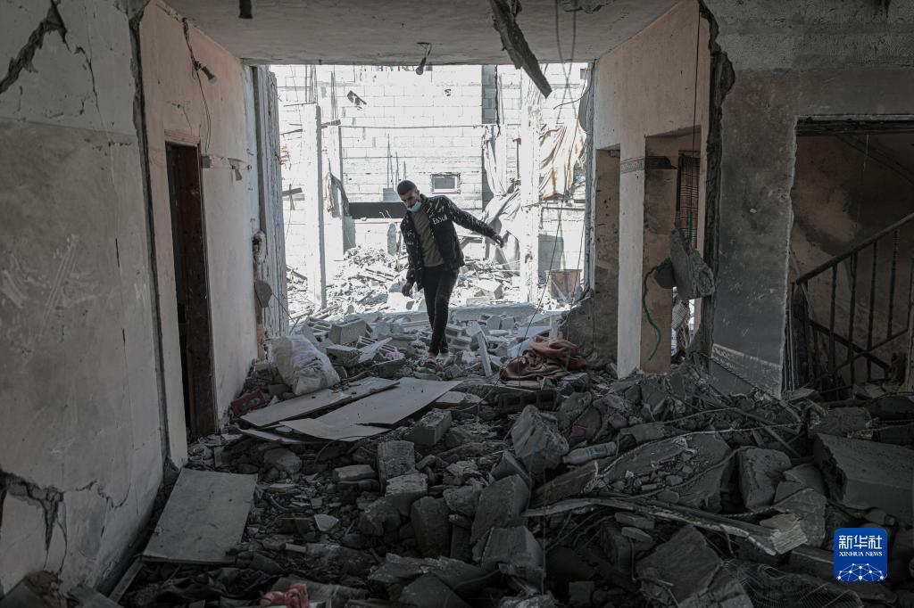 這是11月13日在加沙地帶中部地區拍攝的一個遭以色列空襲的建筑廢墟。