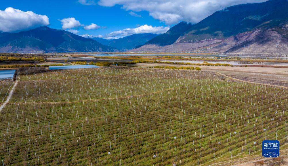 鳥瞰米林市羌納鄉西藏林芝現代蘋果標準化園區(無人機照片,11月13日攝)。