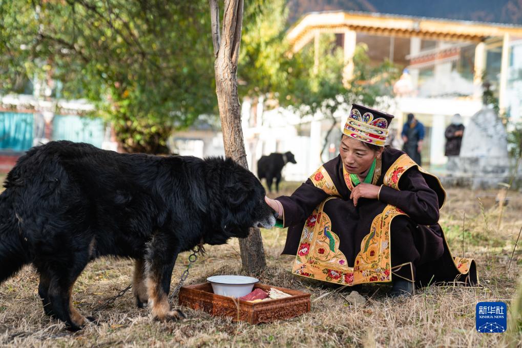 工布新年的大年初一,拉巴卓瑪按照習俗“請狗赴宴”,為家里的狗端來了新鮮牛肉、糌粑和牛奶(11月14日攝)。