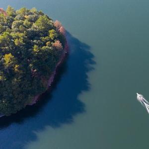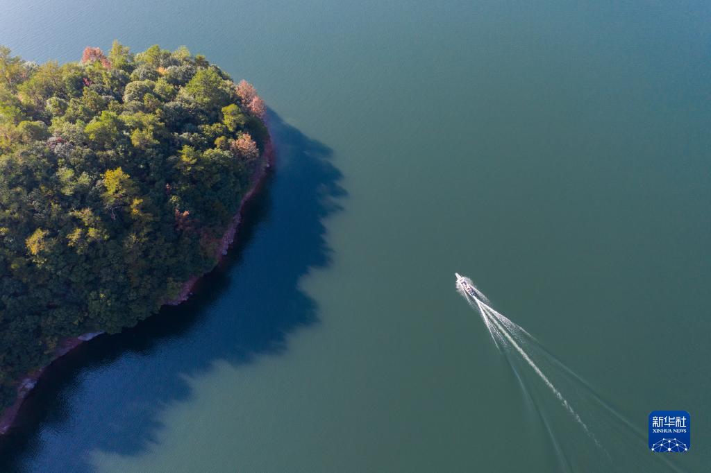 11月14日,淳安縣金峰鄉錦湖村的低收入農戶在金峰鄉中華蜂保種基地工作人員的陪同下乘坐小船前往養殖中華蜂的小島收蜂蜜(無人機照片)。