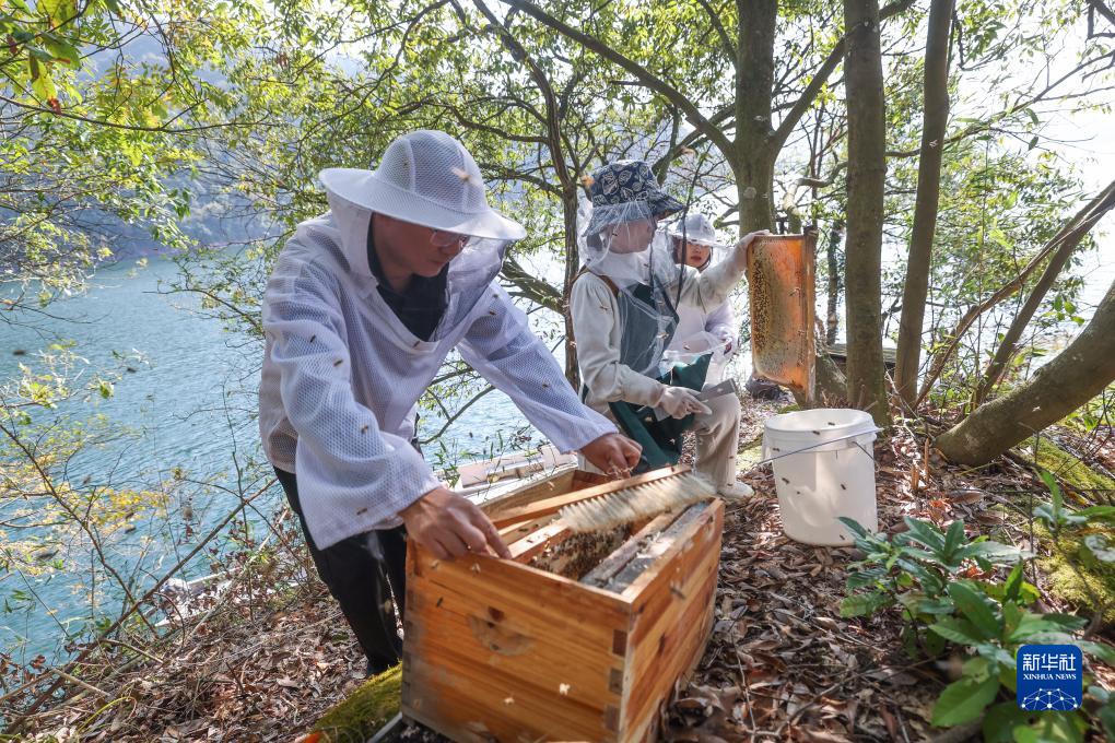 11月14日,淳安縣金峰鄉中華蜂保種基地工作人員在養殖中華蜂的小島收“淳蜜共富”的蜂蜜。