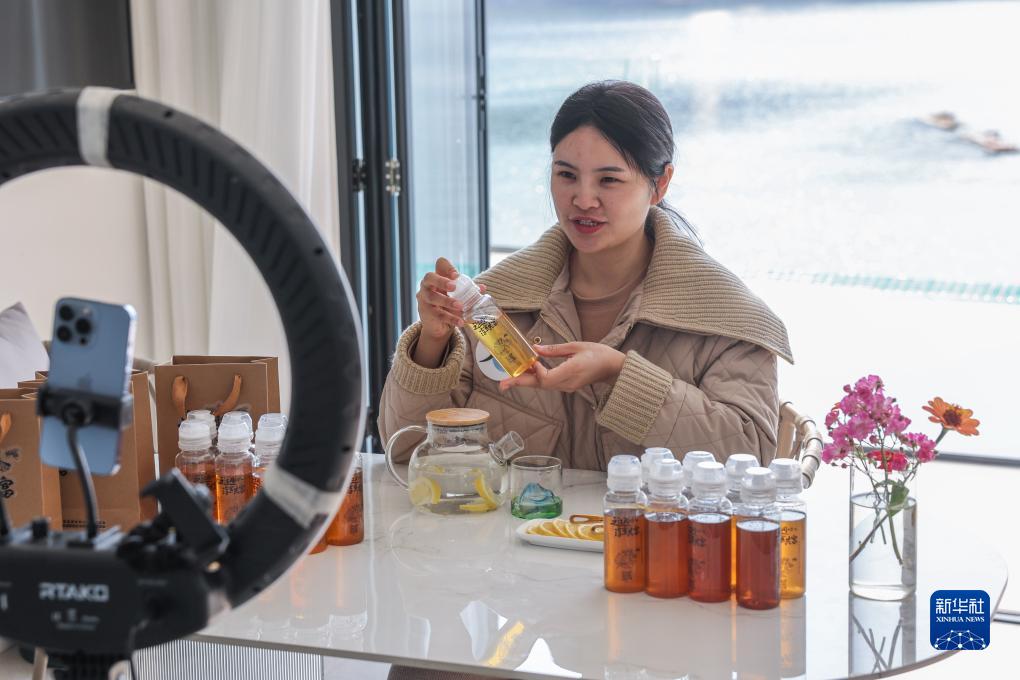 11月14日,在淳安縣宋村鄉一家民宿內,愛心人士正在為“淳蜜共富”活動進行網絡直播,銷售蜂蜜。