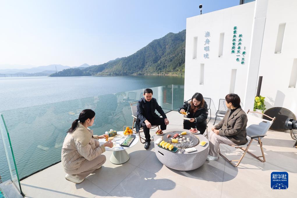 11月14日,在淳安縣宋村鄉一家民宿外,游客在品嘗蜂蜜?!按久酃哺弧被顒影烟厣涿郛a品作為特色農產品放在多個民宿進行推介。