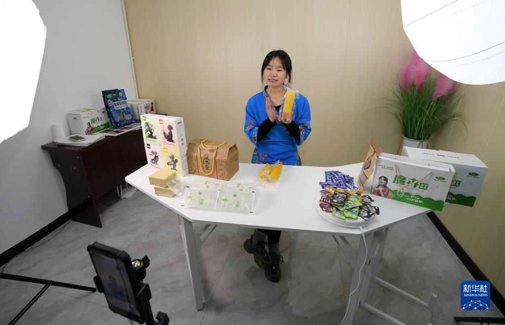 11月14日,在施秉縣產業園區一家電商企業的直播間,主播在推介本地村民種植的低糖甜糯鮮食玉米。