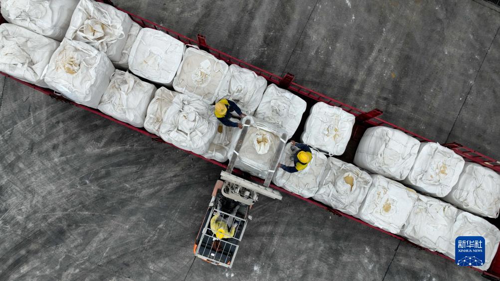 11月14日,工人在施秉縣一家飼料生產企業內搬運飼料(無人機照片)。