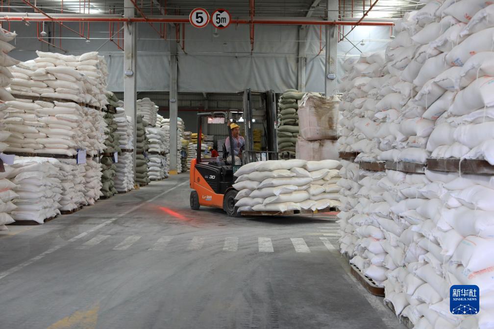 11月14日,工人在施秉縣一家飼料生產企業車間內搬運飼料。