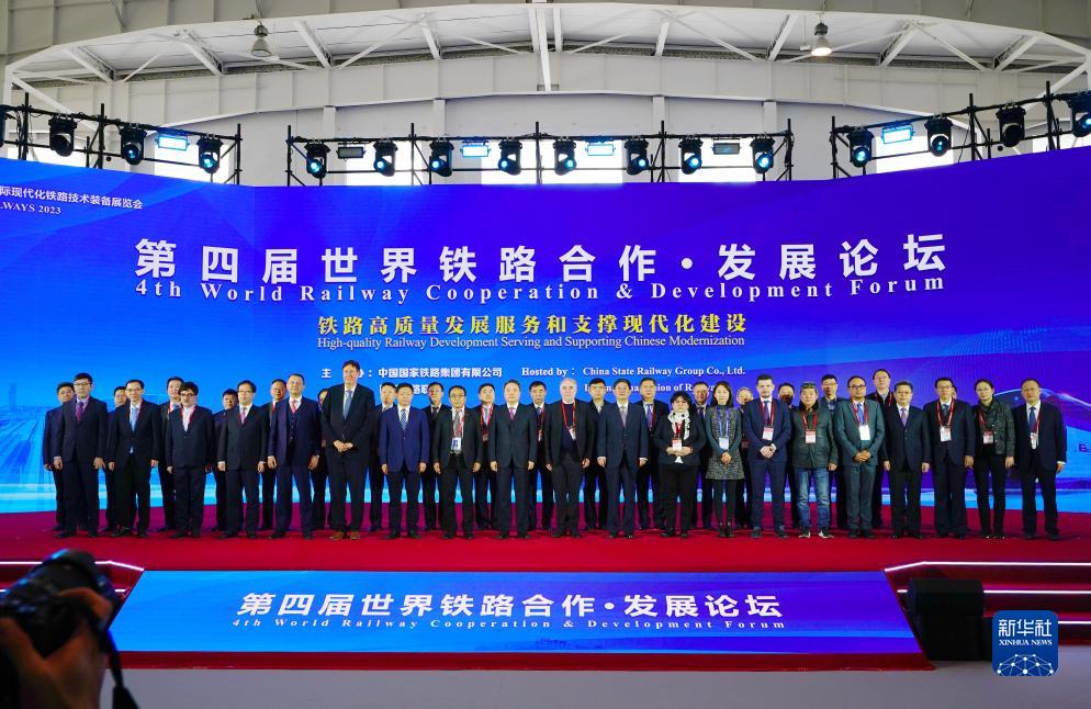 11月14日,參加第四屆世界鐵路合作·發展論壇的嘉賓在合影留念。