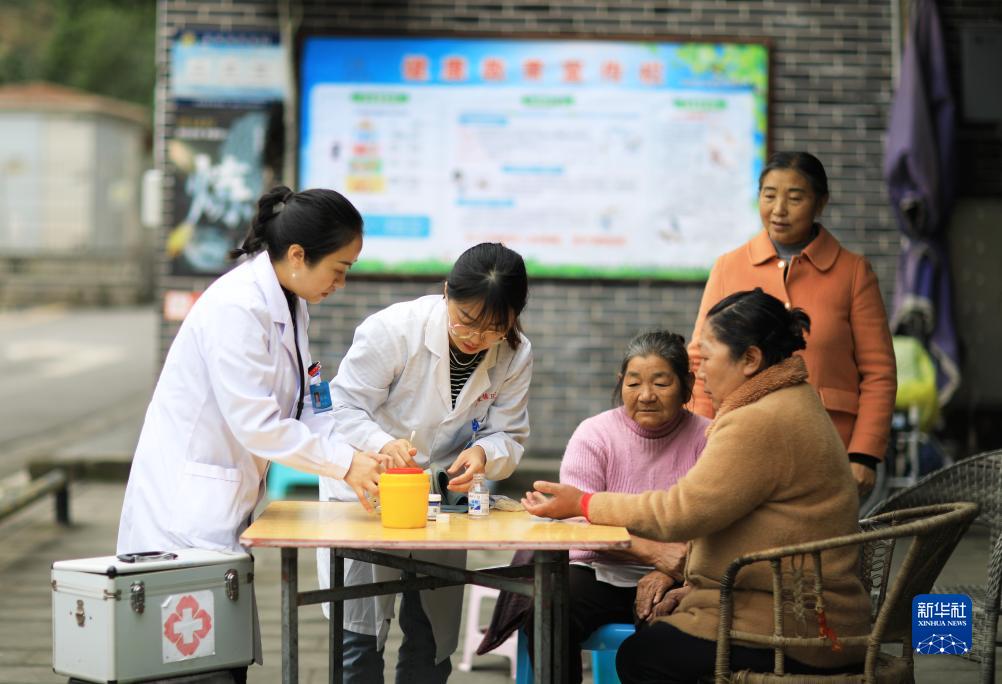 11月14日,在貴州省赤水市丙安鎮,衛生院的醫務人員為群眾測血糖。