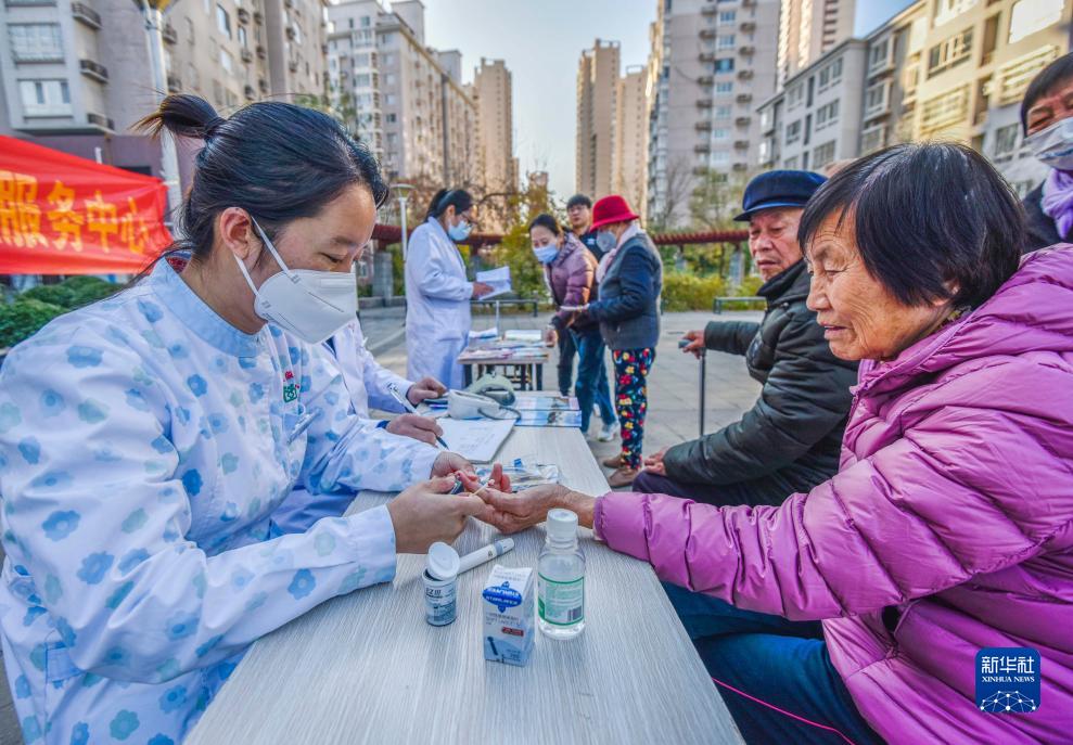 11月14日,河北省遵化市華明路社區衛生服務中心的醫務人員為居民免費檢測血糖。