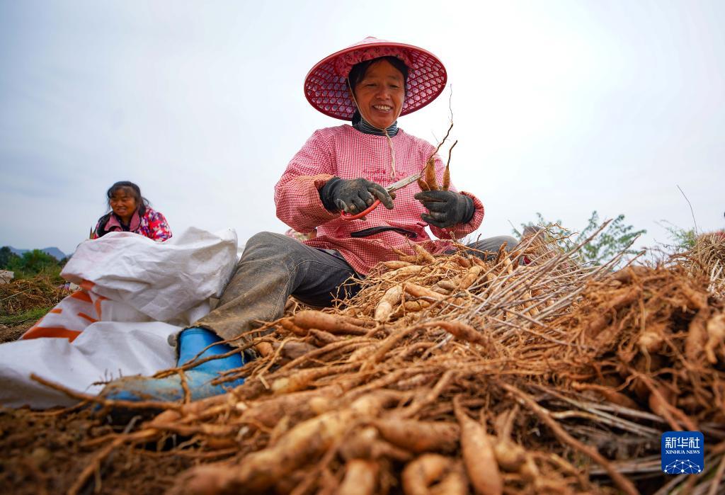 11月14日,貴州省黔東南苗族侗族自治州丹寨縣興仁鎮中營村村民在收獲中藥材天冬。