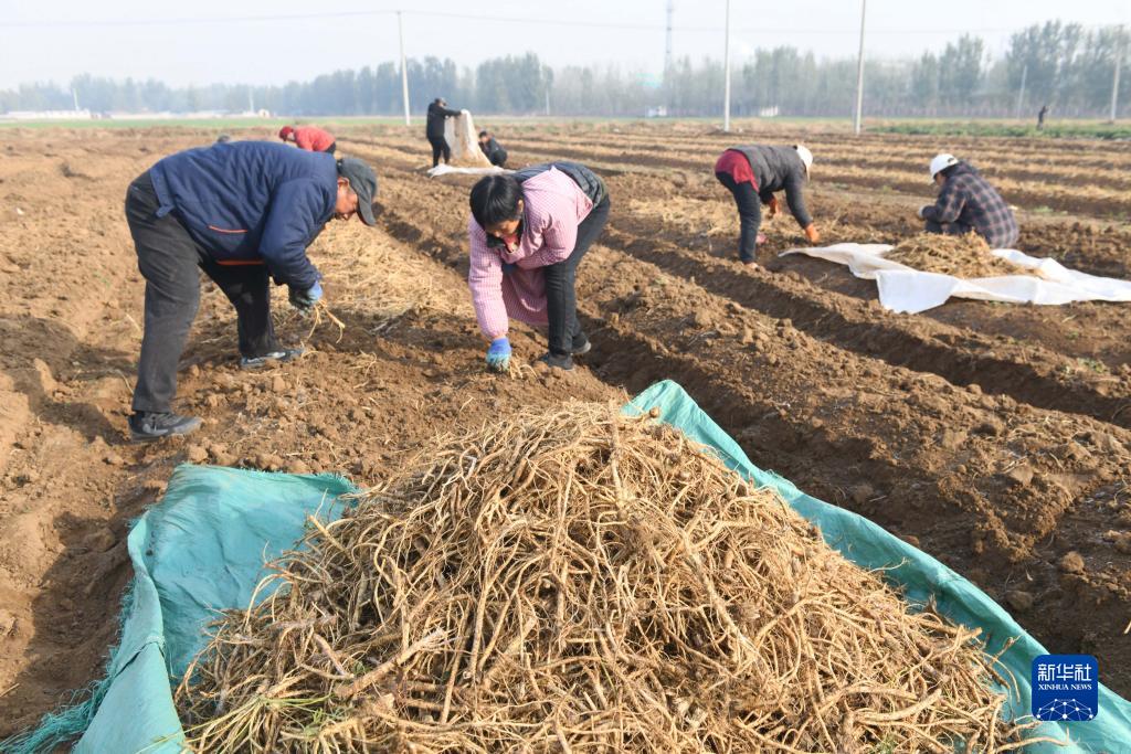 11月13日,在河北省新樂市馬頭鋪南雙晶村,種植專業合作社的農民收獲中藥材。