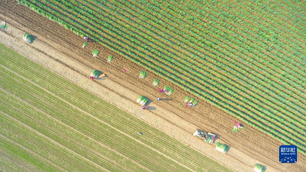 11月14日,山東省聊城市茌平區賈寨鎮邢胡劉村農民在田間收獲大蔥(無人機照片)。