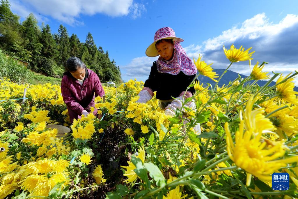 11月13日,福建武夷山市興田鎮城村村民在金絲皇菊種植基地采摘金絲皇菊。