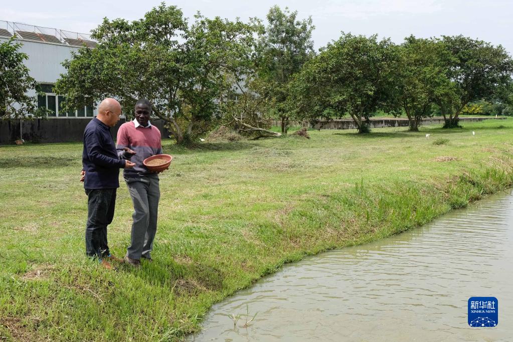 在烏干達首都坎帕拉市郊的烏干達水產研究與發展中心,一名當地員工在池塘邊與來自中國的水產專家陳太華交流(2022年12月21日攝)。烏干達水產研究與發展中心是中國-聯合國糧農組織-烏干達(三期)南南合作項目水產示范基地,這里的漁場排灌系統采用中國技術建設而成。