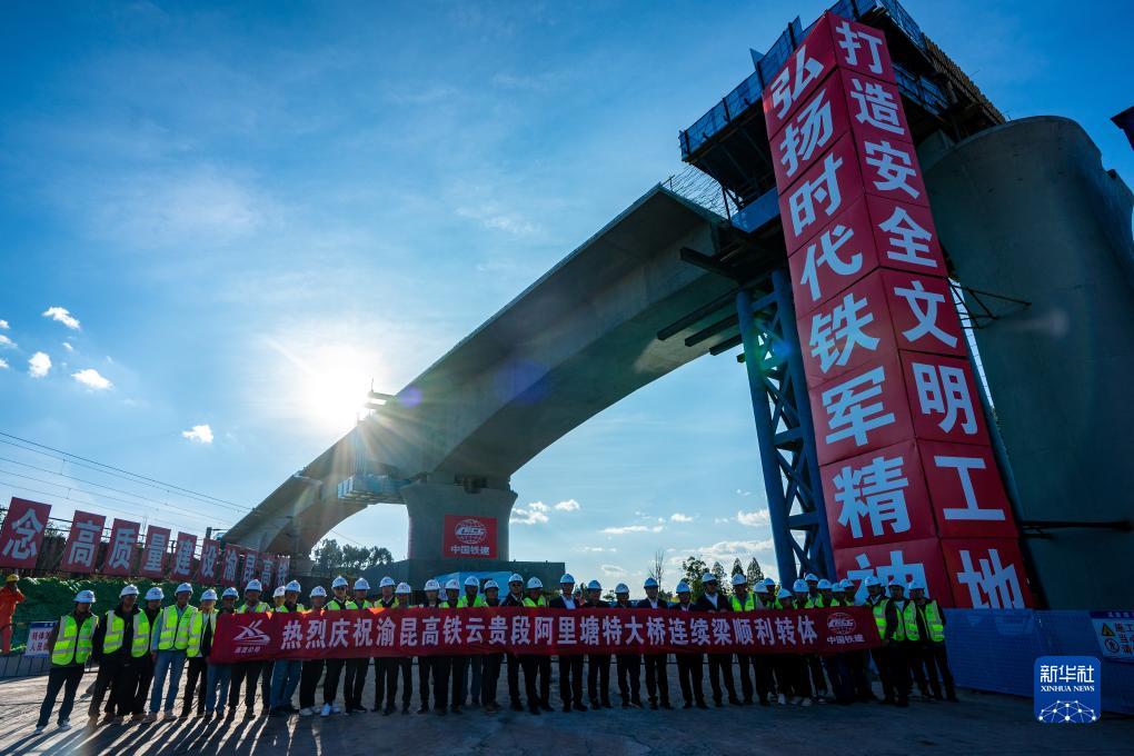 當日,歷經1個多小時的空中轉體作業,由中鐵四局承建的渝昆高鐵八家村跨滬昆鐵路特大橋、中鐵十六局集團承建的渝昆高鐵阿里塘特大橋連續梁同步成功轉體,在滬昆鐵路上方實現精準對接,標志著渝昆高鐵橋梁建設取得新突破。