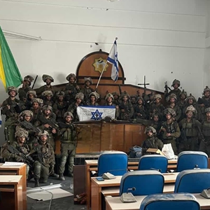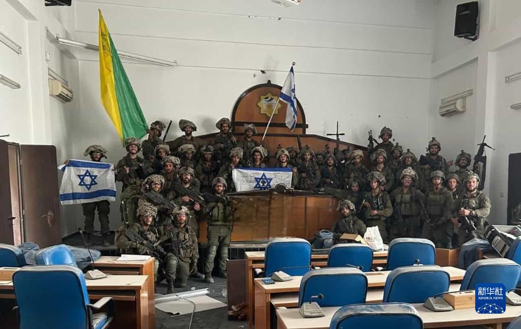 這張以色列媒體11月13日刊發的照片顯示,以色列國防軍士兵在加沙城巴勒斯坦伊斯蘭抵抗運動(哈馬斯)立法委員會大樓里舉著以色列國旗。