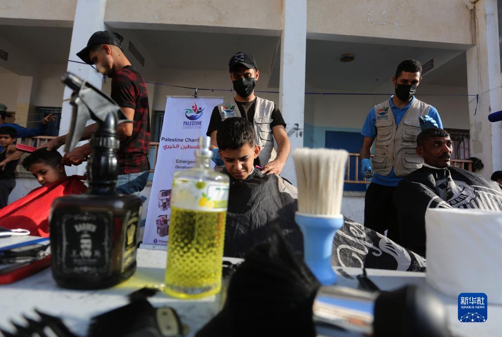 11月14日,在加沙地帶南部城市拉法,志愿者為流離失所的巴勒斯坦人理發。