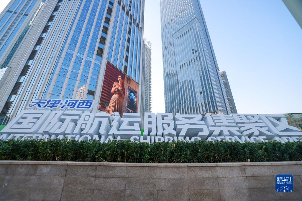 這是在天津小白樓中央商務區一棟商務樓宇下拍攝的航運服務集聚區標志牌(11月14日攝)。