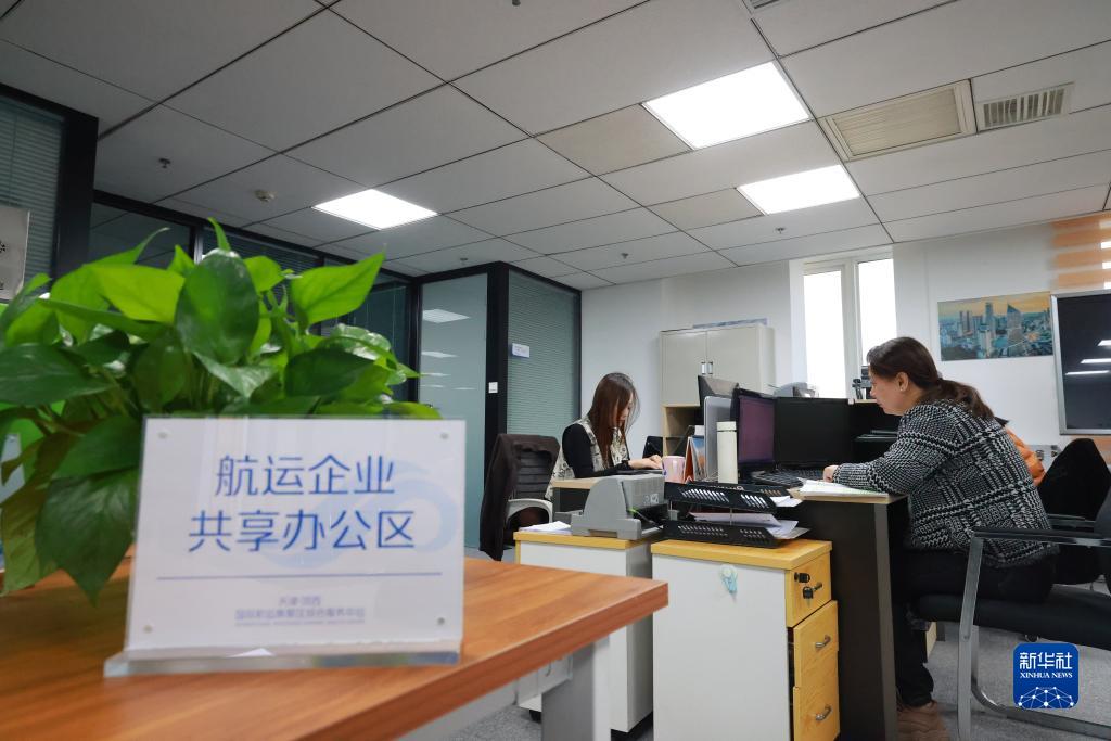 在天津國際航運大廈,企業職工在航運企業共享辦公區內辦公(11月14日攝)。