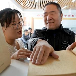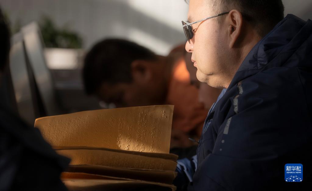 11月14日,在內蒙古烏拉特前旗圖書館視障閱覽室內,一名視障人士用指尖“閱讀”盲文書籍。