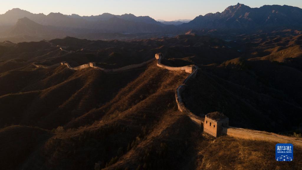 這是11月14日拍攝的夕陽下的古北口長城蟠龍山段(無人機照片)。