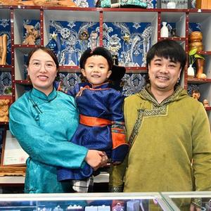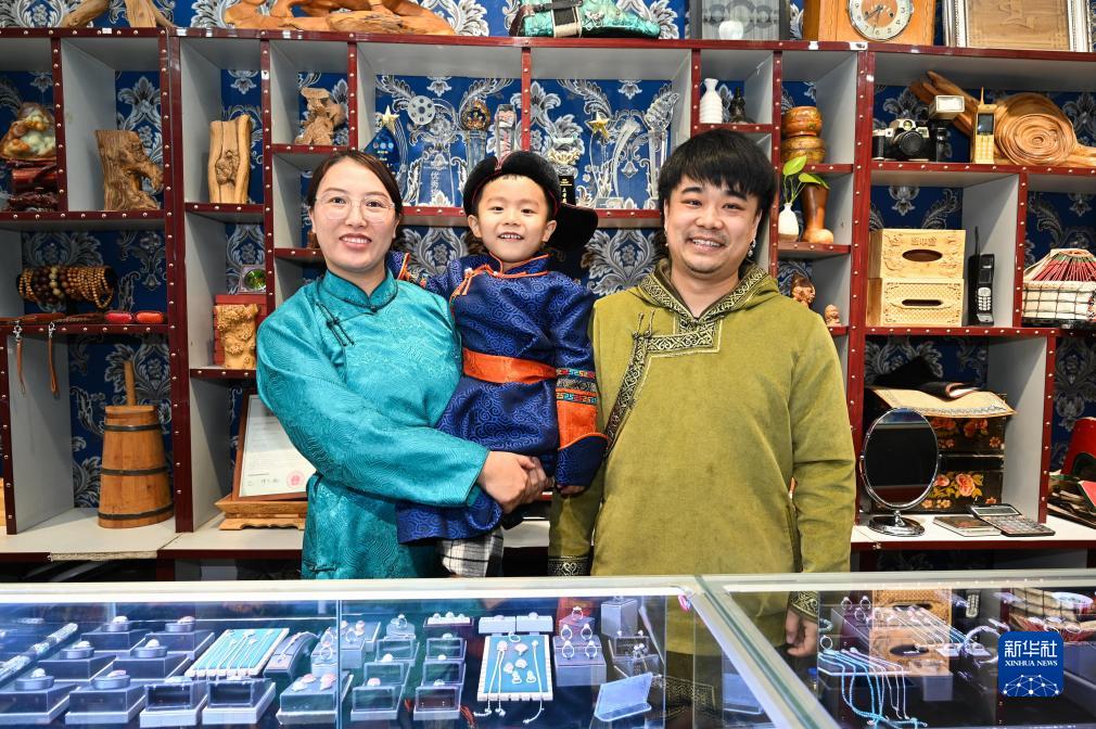 11月14日,在內蒙古烏拉特前旗禾蘇格爾銀匠店內,齊天賜(右)與愛人蘇曉霞和兒子合影。