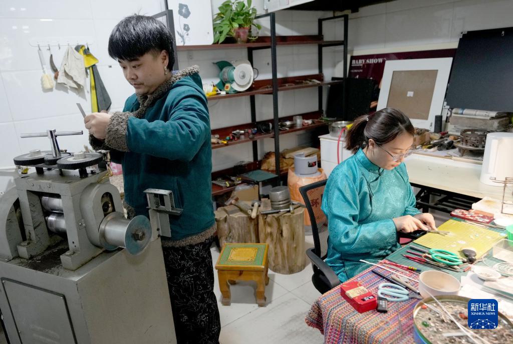 11月14日,在內蒙古烏拉特前旗禾蘇格爾銀匠店內,齊天賜(左)與愛人蘇曉霞一同加工銀器。