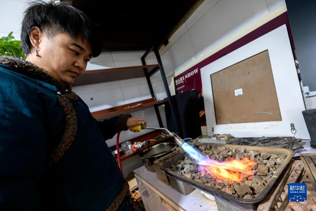 11月14日,在內蒙古烏拉特前旗禾蘇格爾銀匠店內,齊天賜在熔銀。