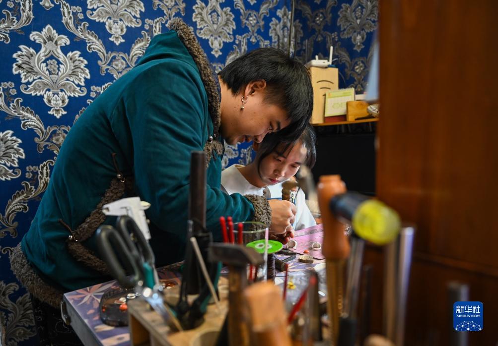 11月14日,在內蒙古烏拉特前旗禾蘇格爾銀匠店內,齊天賜(左)在教授學徒。