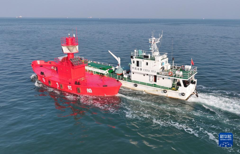 11月15日,青島航標處一艘工作船將新的航標燈船送往作業海域(無人機照片)。