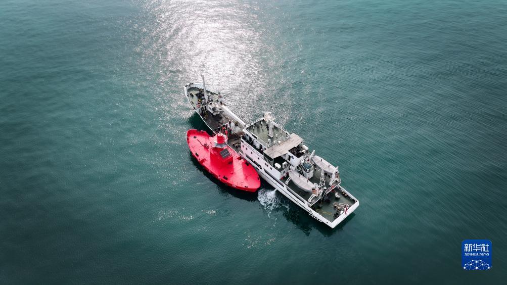 11月15日,青島航標處一艘工作船在進行燈船更換作業(無人機照片)。
