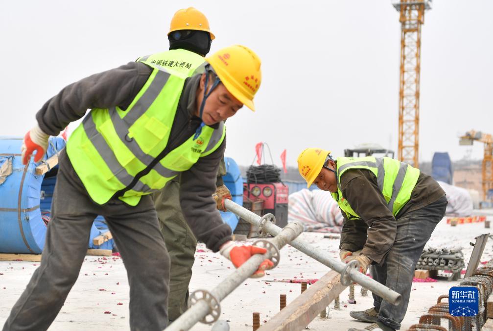 11月15日,中國鐵建大橋工程局工人在西延高鐵王家河特大橋施工。