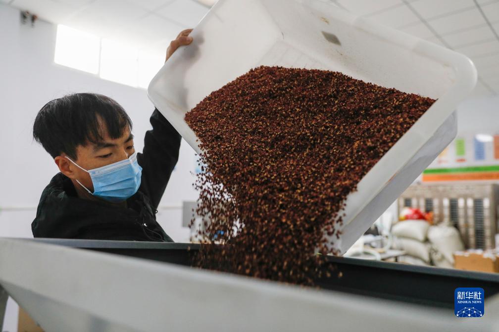 11月15日,在舟曲縣電子商務公共服務中心,工作人員將花椒倒入篩選機。