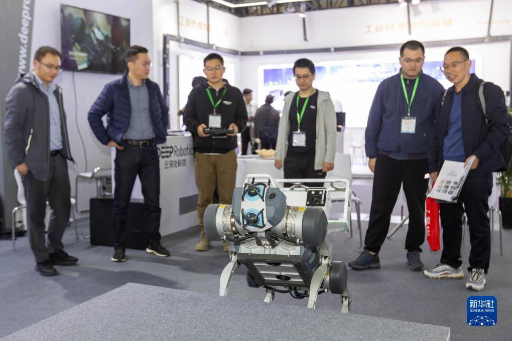 11月15日,在上海國際電力設備及技術展覽會的云深處科技展位,工作人員演示搭載熱成像雙光譜云臺的四足機器人爬樓梯巡檢。