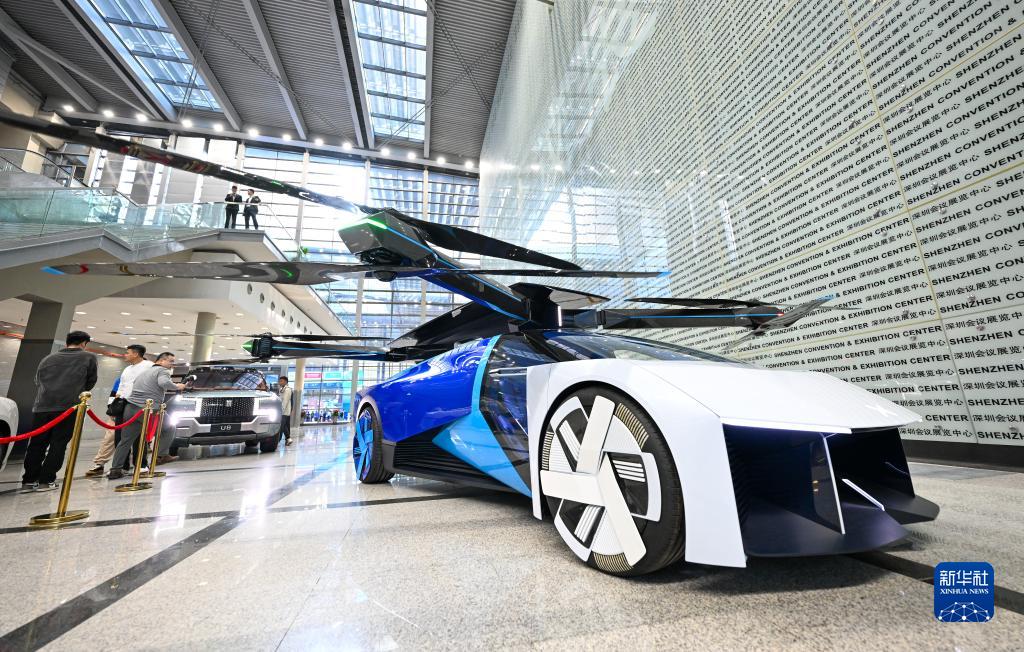 11月15日,在第二十五屆高交會上,機臂、旋翼等飛行系統可以完全折疊收納的小鵬匯天陸空一體式飛行汽車對公眾展出。