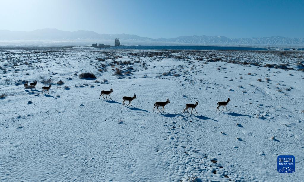 11月15日,一群鵝喉羚在阿克塞縣境內的雪地上活動覓食(無人機照片)。