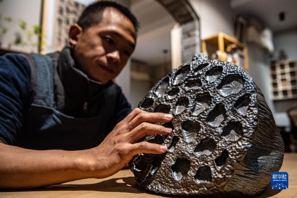 11月14日,管永雙在展示陶藝作品。