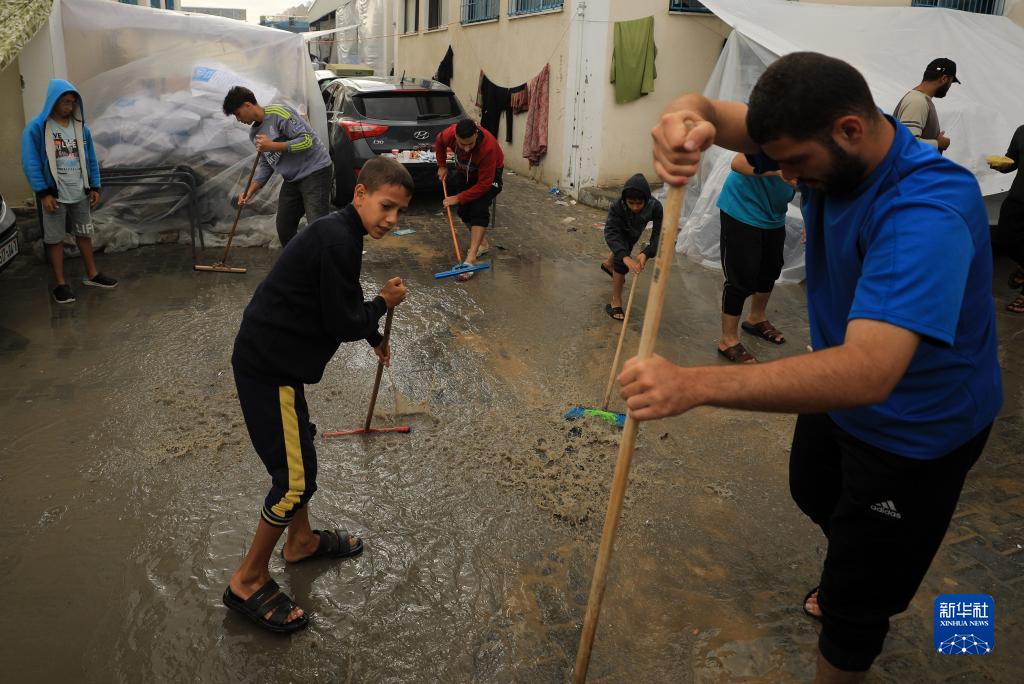11月15日,巴勒斯坦人在加沙地帶南部城市汗尤尼斯的一處臨時營地清理道路。