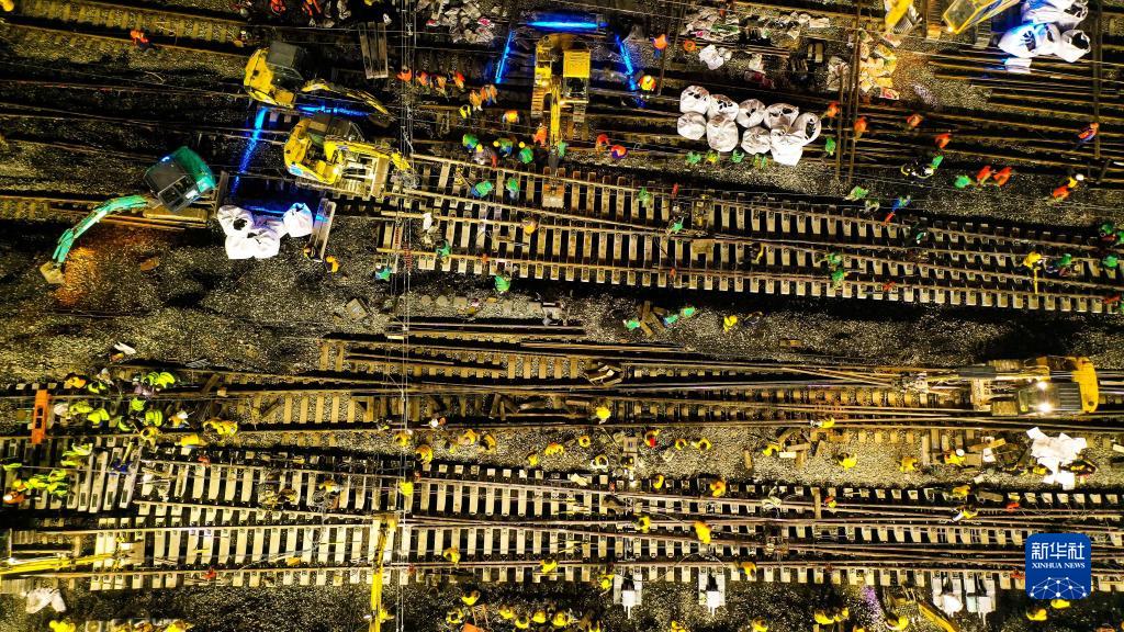 11月15日夜間,在濟南火車站,中鐵十局的工作人員正在對濟鄭高鐵引入濟南站進行站改作業(無人機照片)。