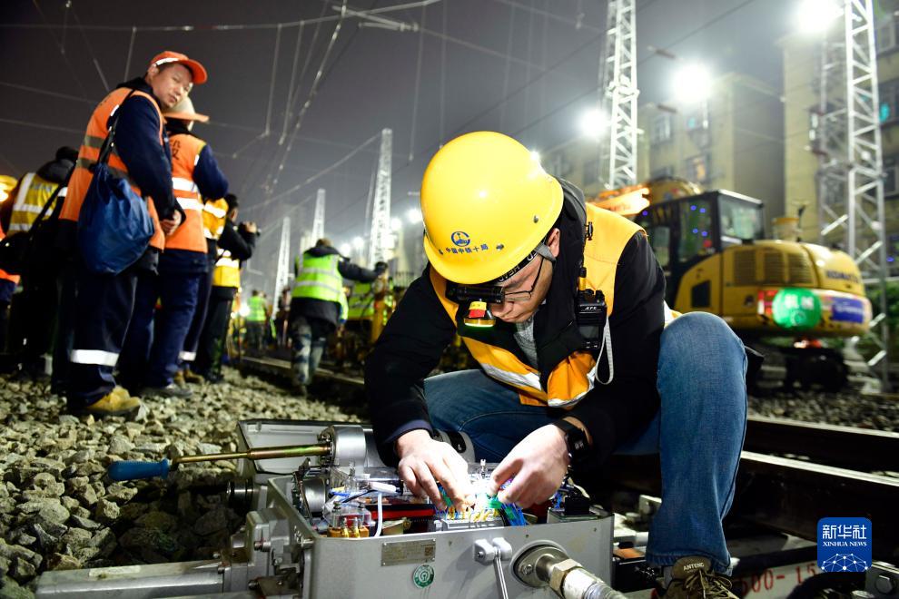 11月15日夜間,在濟南火車站,中鐵十局的工作人員正在對濟鄭高鐵引入濟南站進行信號專業改造作業。