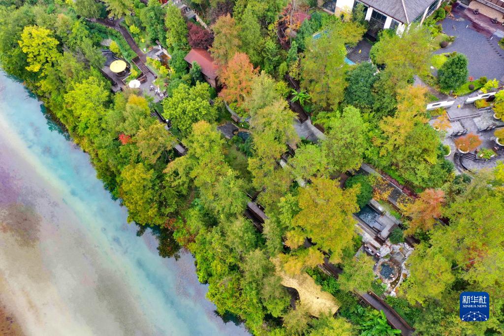 在石阡縣佛頂山溫泉小鎮內,環境優美的溫泉設施掩映在樹林中(無人機照片,11月15日攝)。