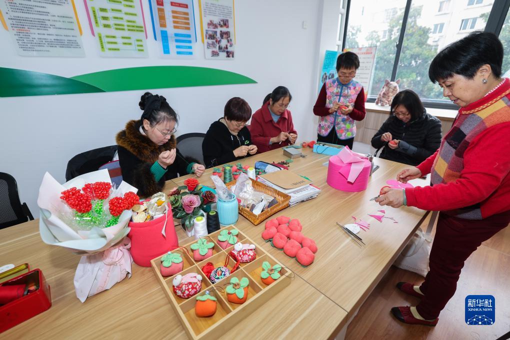 11月16日,嘉興市南湖區東柵街道新南社區的志愿者在做手工藝品,作為新年禮物送給社區老人。