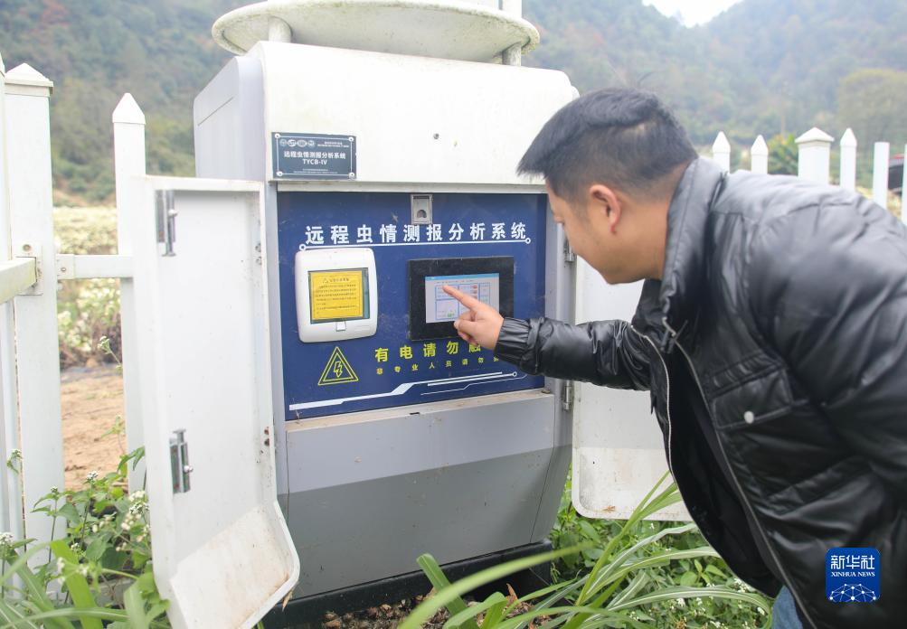 11月16日,歙縣深渡鎮定潭村黃山貢菊智慧農業示范基地負責人通過蟲情測報分析設備查看病蟲害情況。